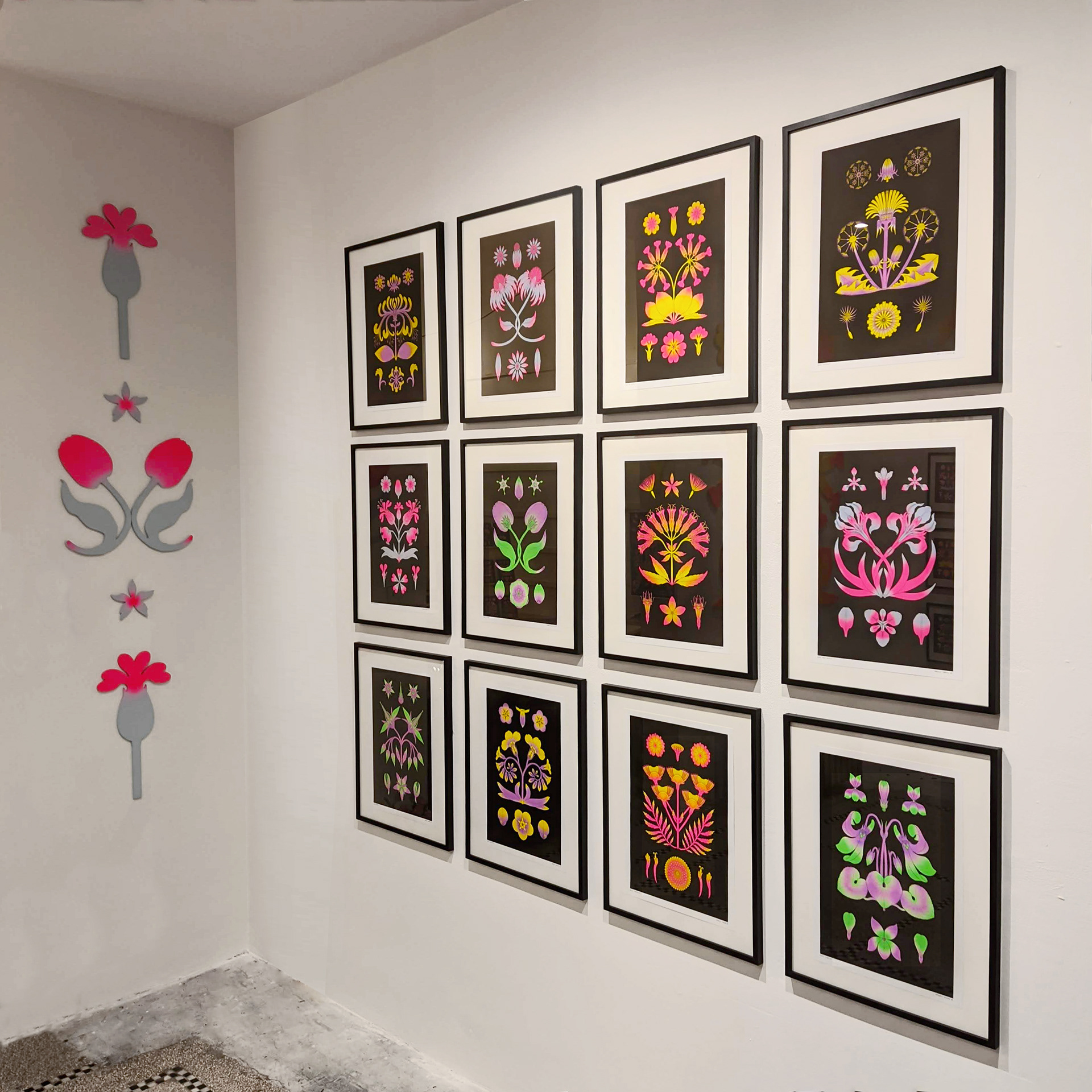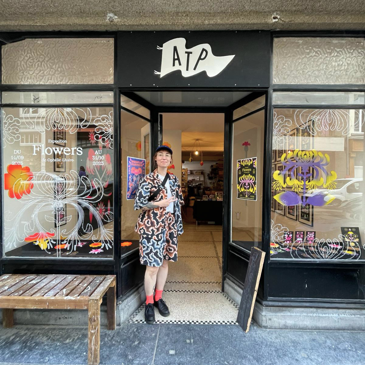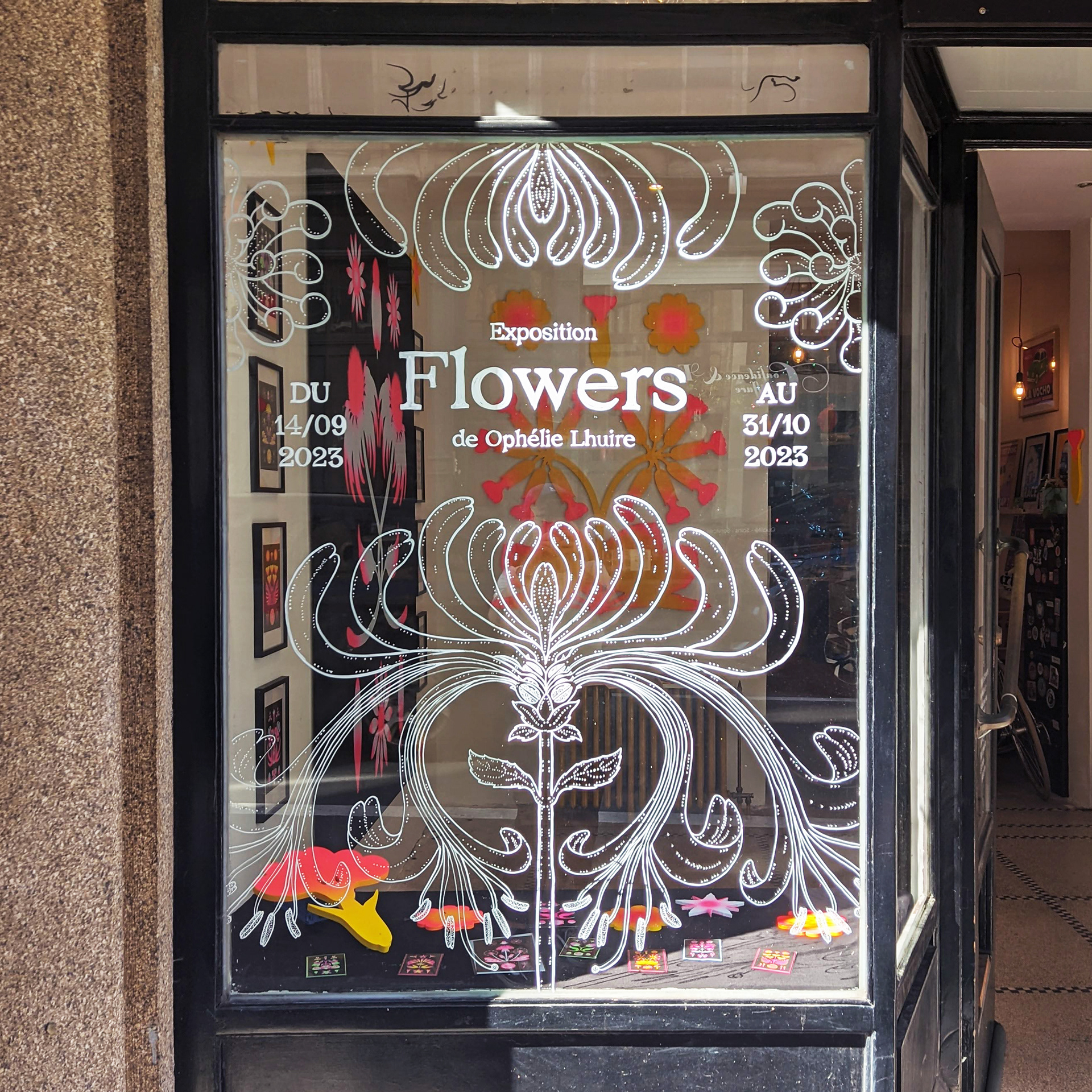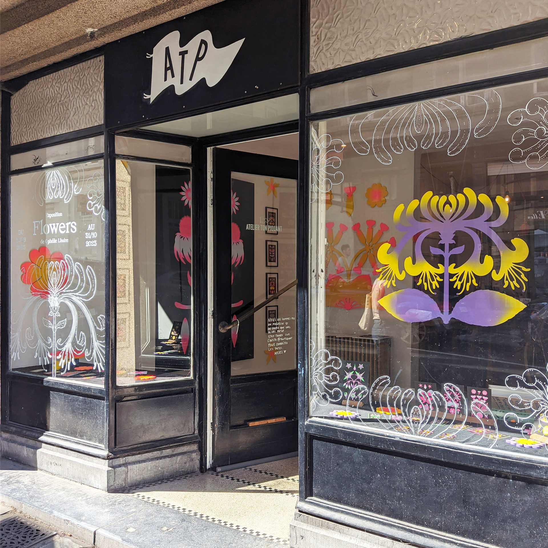 Exposition "Flowers" dans la galerie de l'Atelier Ton Piquant, du 14 septembre au 31 octobre 2023, à Bruxelles. Risographies, bois et aérographe.