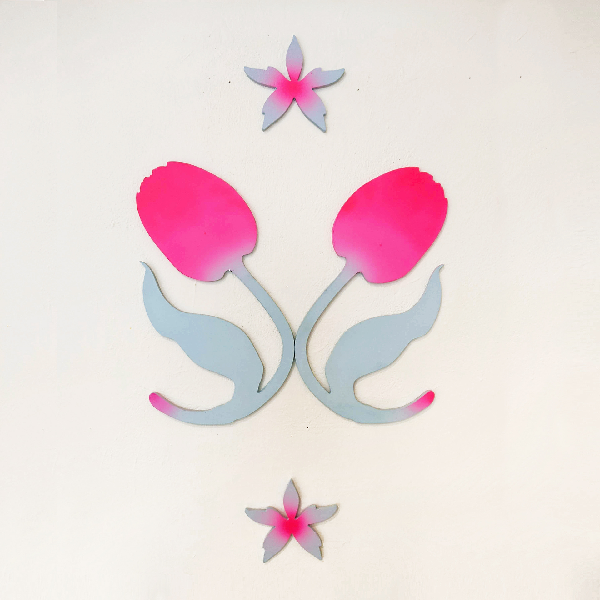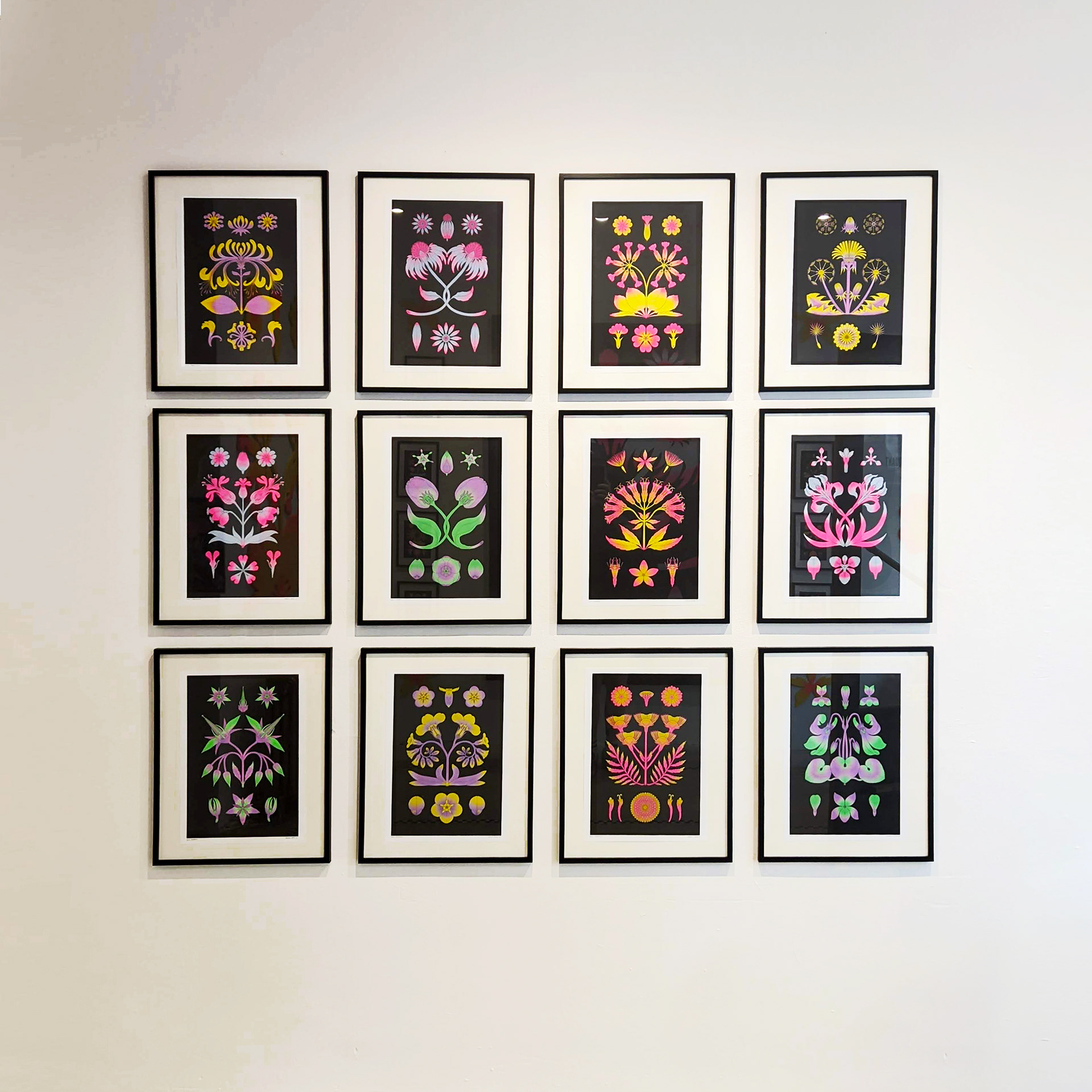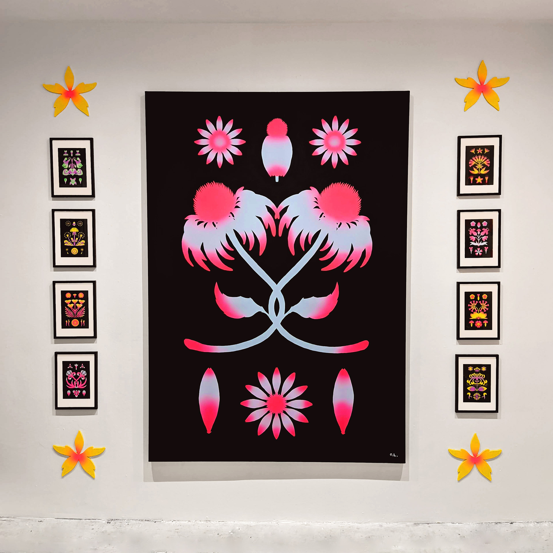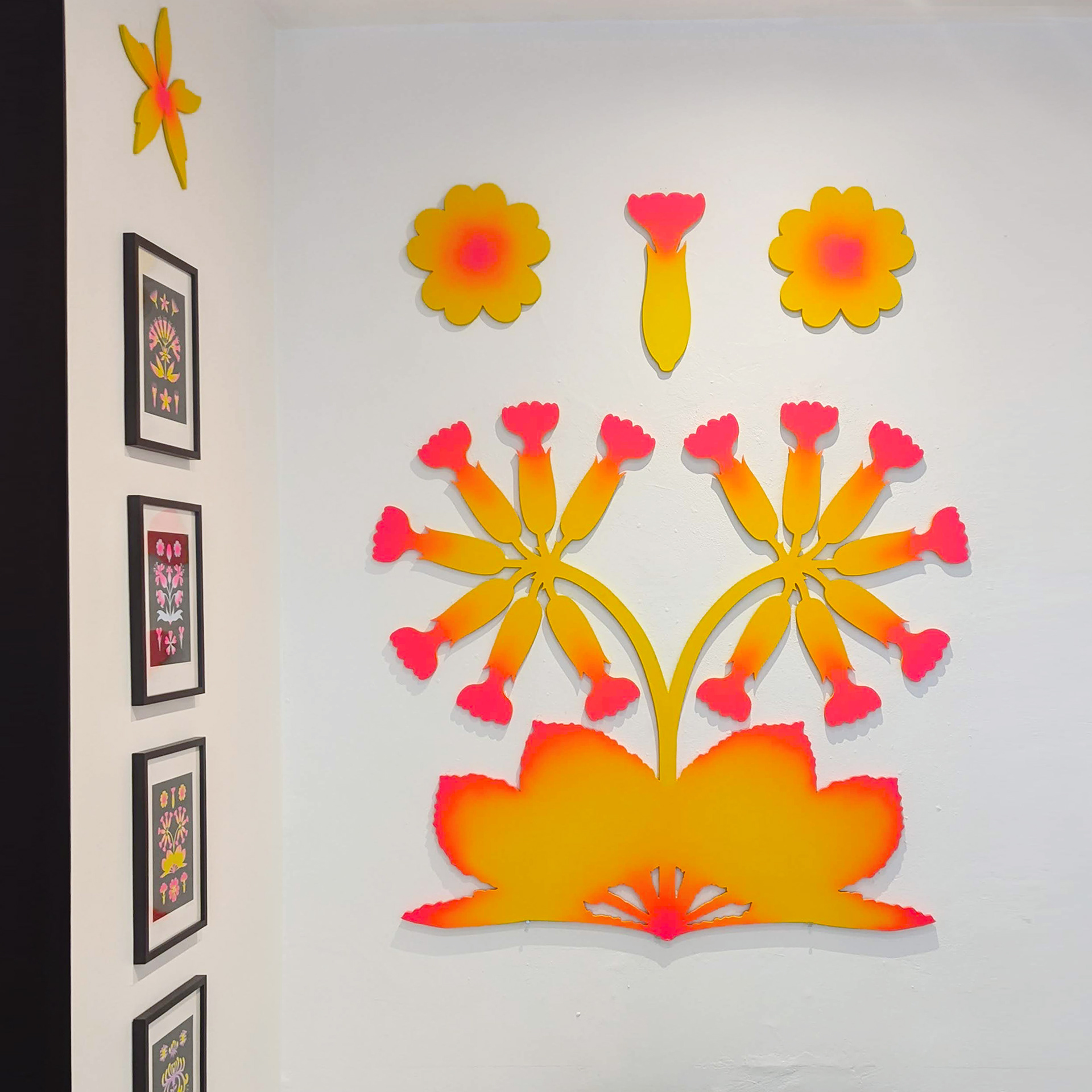 Exposition "Flowers" dans la galerie de l'Atelier Ton Piquant, du 14 septembre au 31 octobre 2023, à Bruxelles. Risographies, bois et aérographe.
