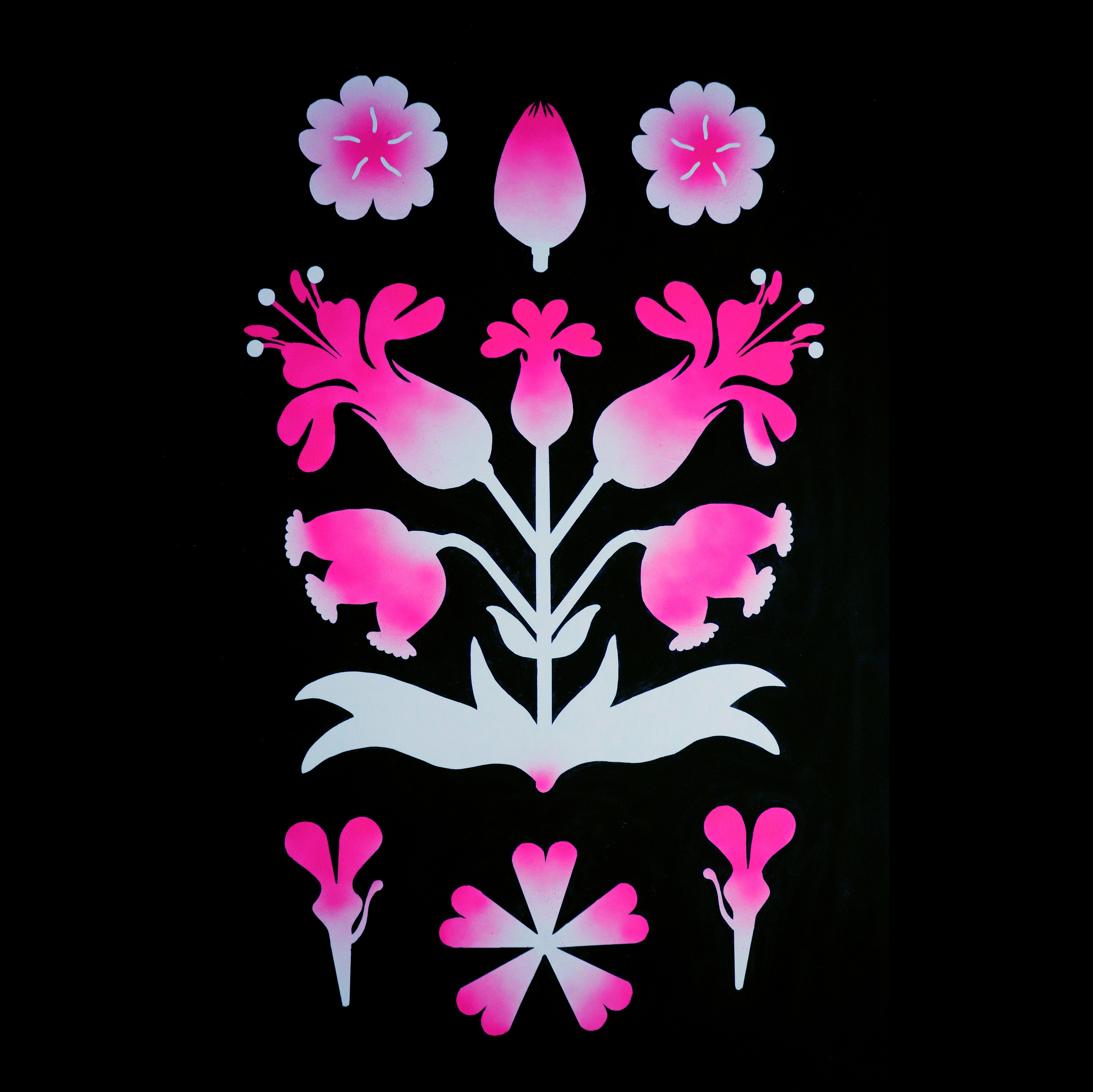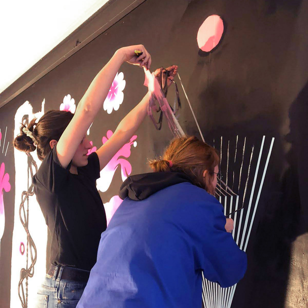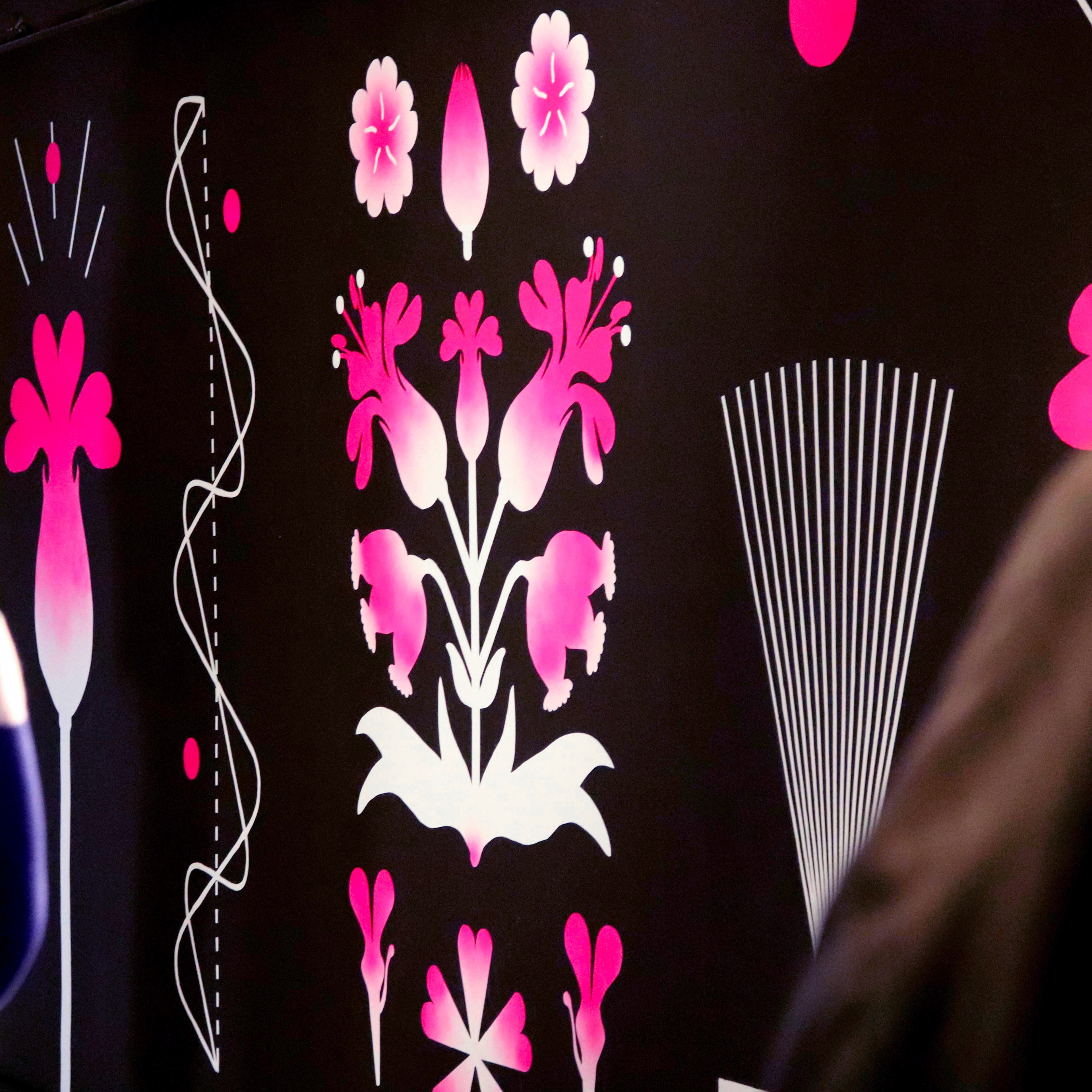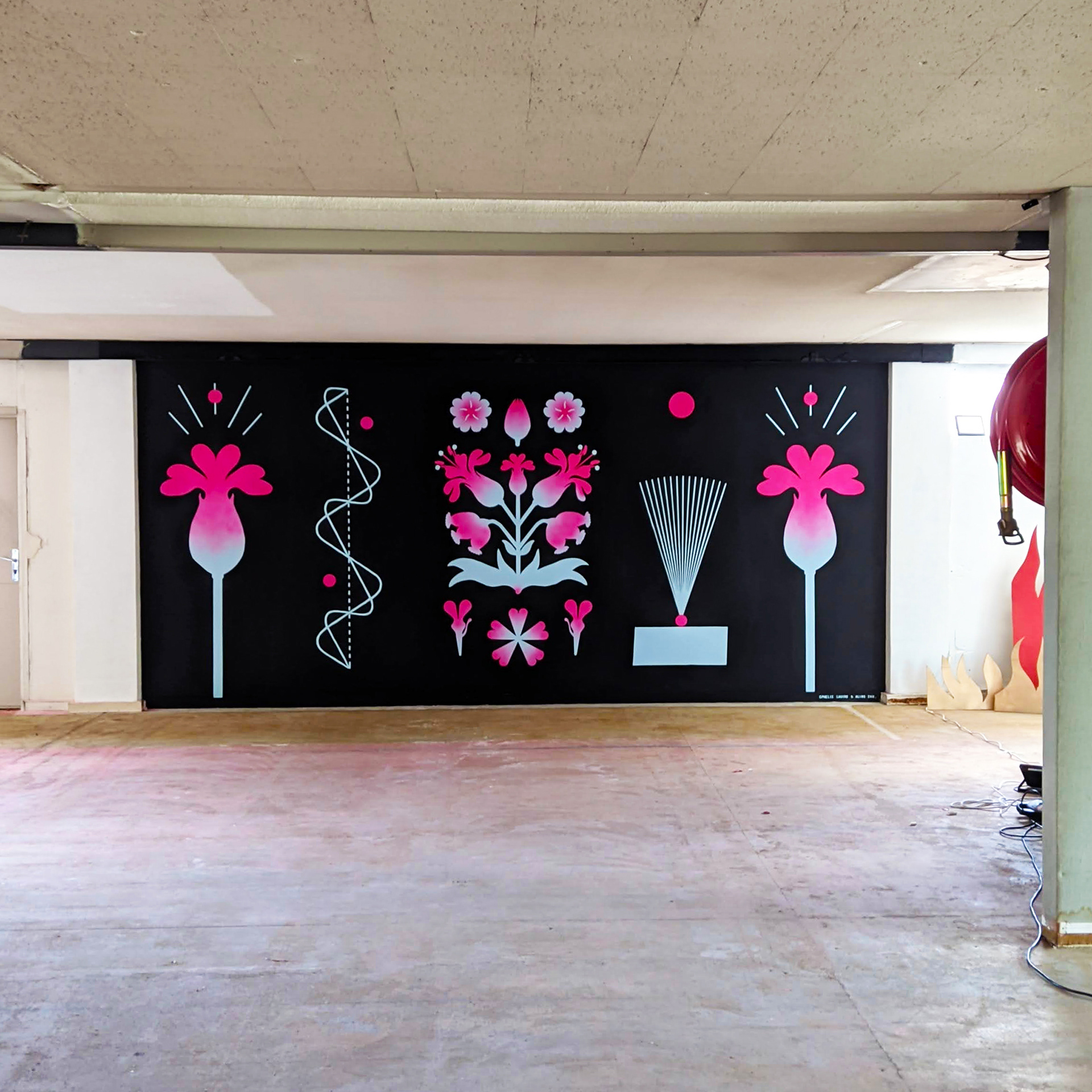 Création d'une fresque en collaboration avec Aline Jan pendant notre résidence à Nice dans l'entreprise de luminaires Resistex. Schémas scientifiques lumineux : Aline Jan Motifs floraux : Ophélie Lhuire.