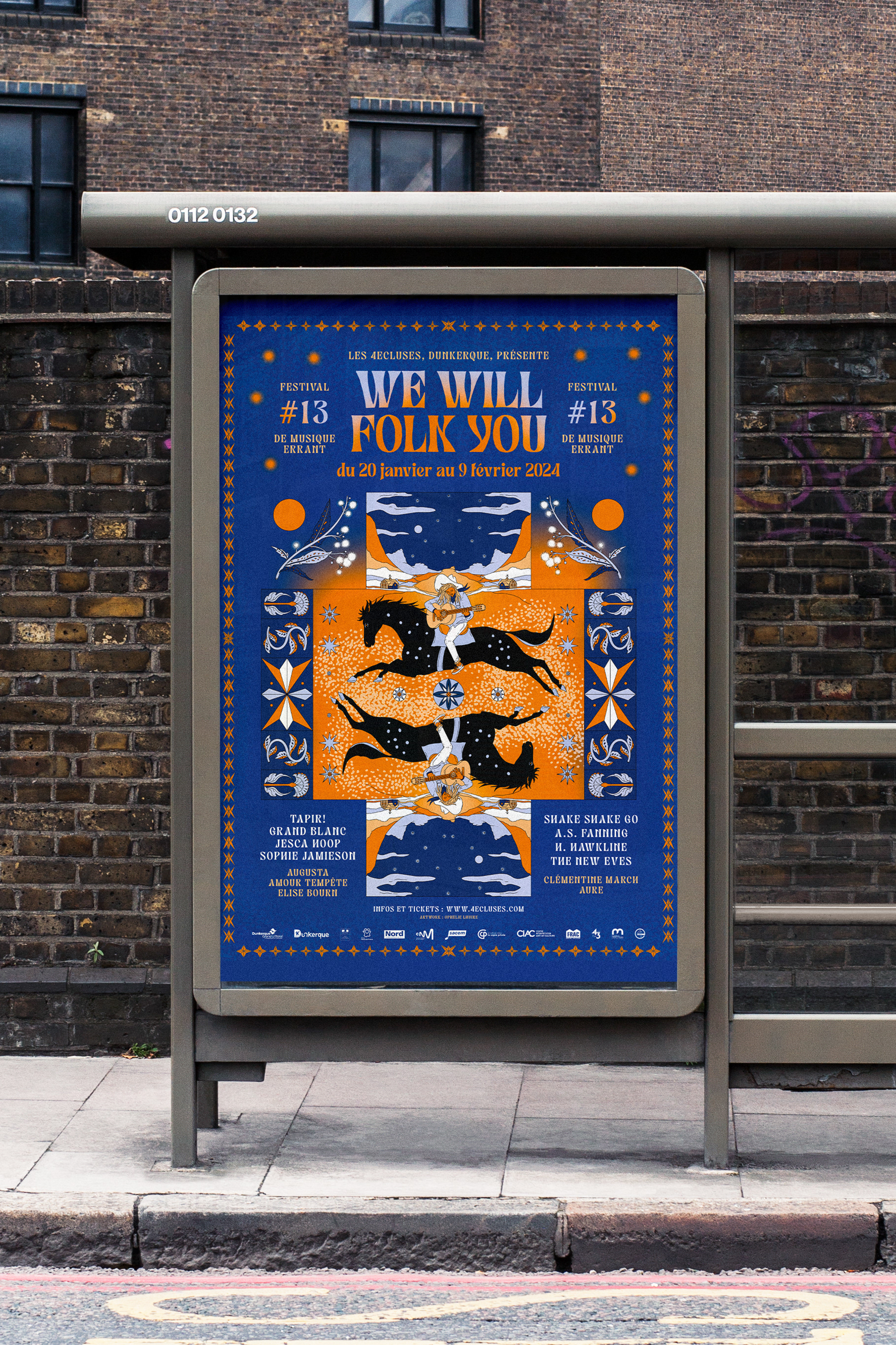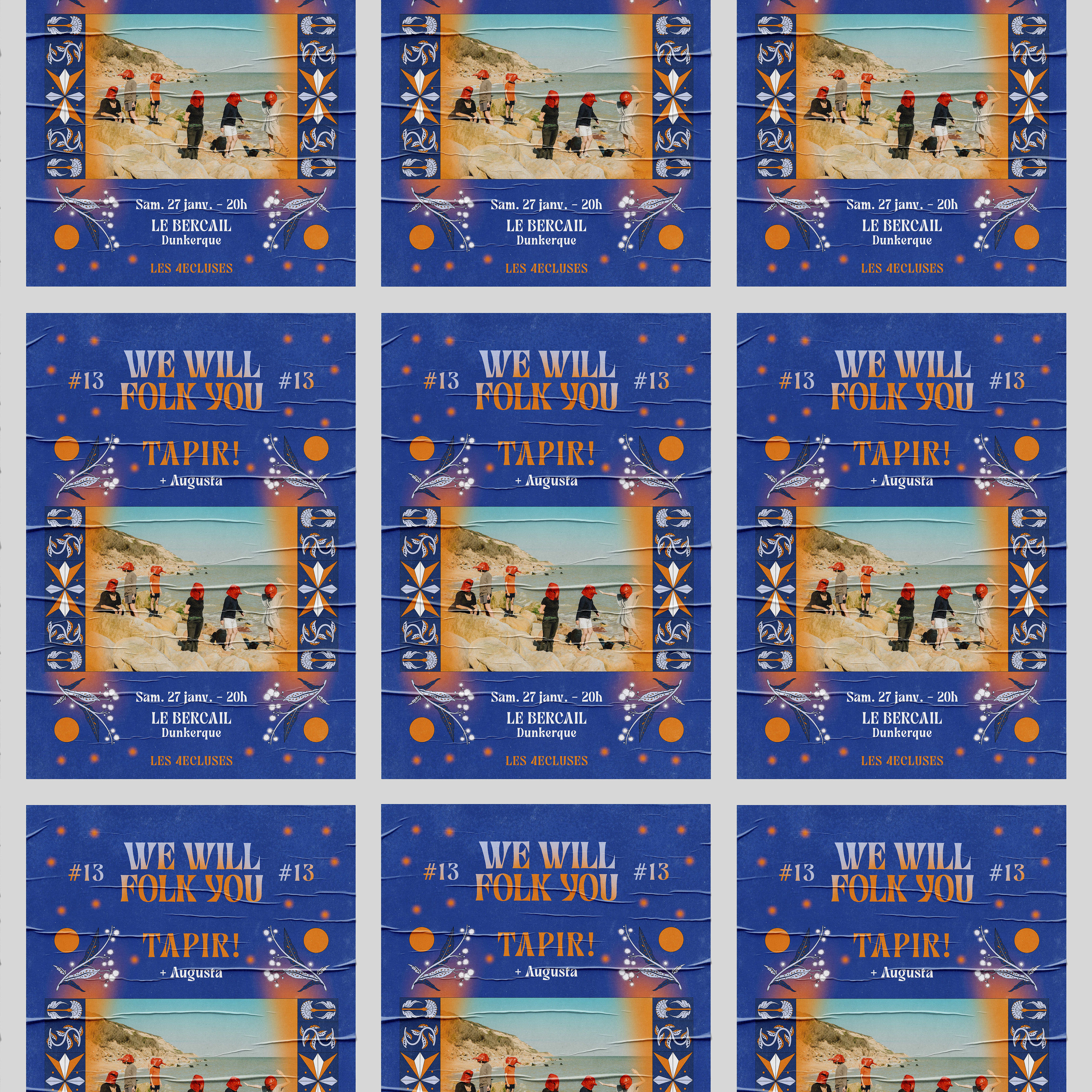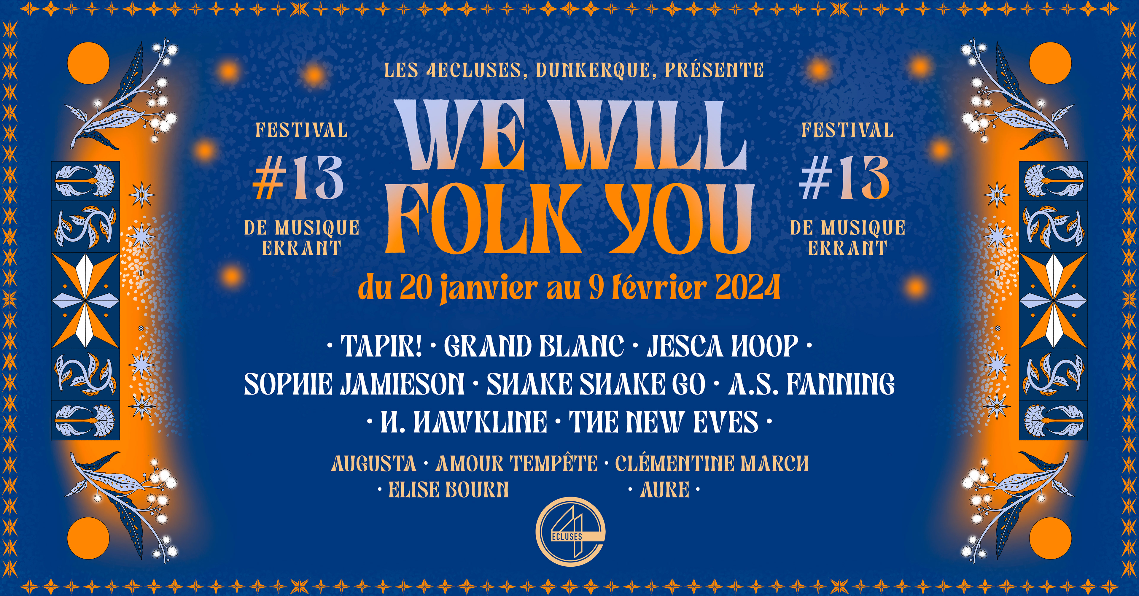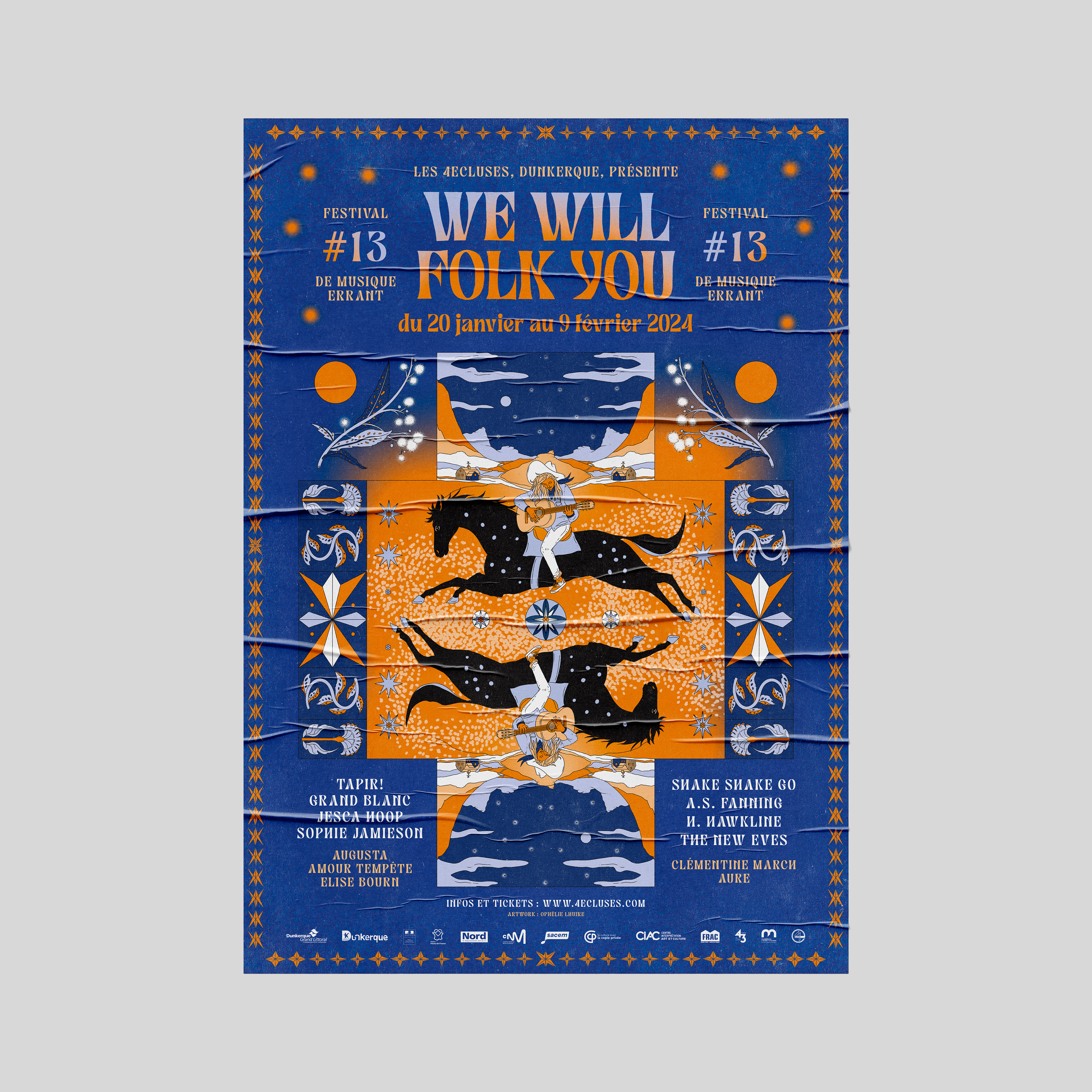 Création de l'identité visuelle pour le festival de musique folk : WE WILL FOLK YOU #13, pour les 4Ecluses. DATE : 20 janvier au 9 février 2024 LIEU : Dunkerque CLIENT : Les 4Ecluses SITE WEB : www.4ecluses.com