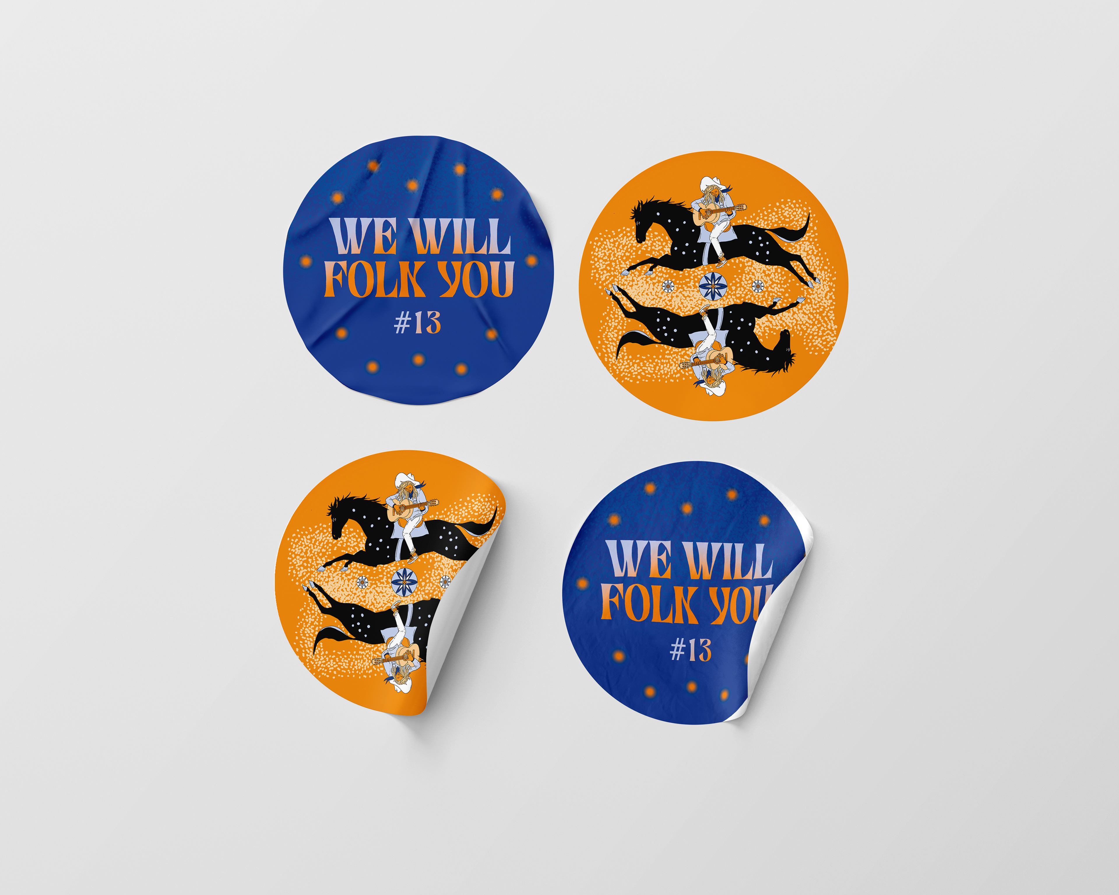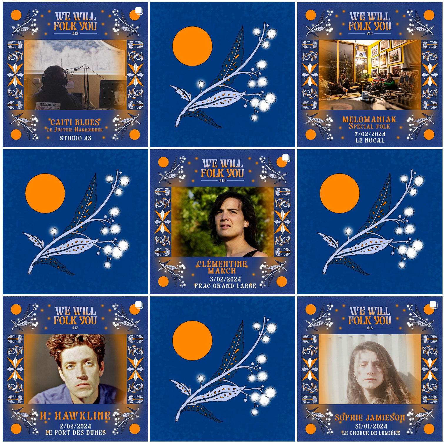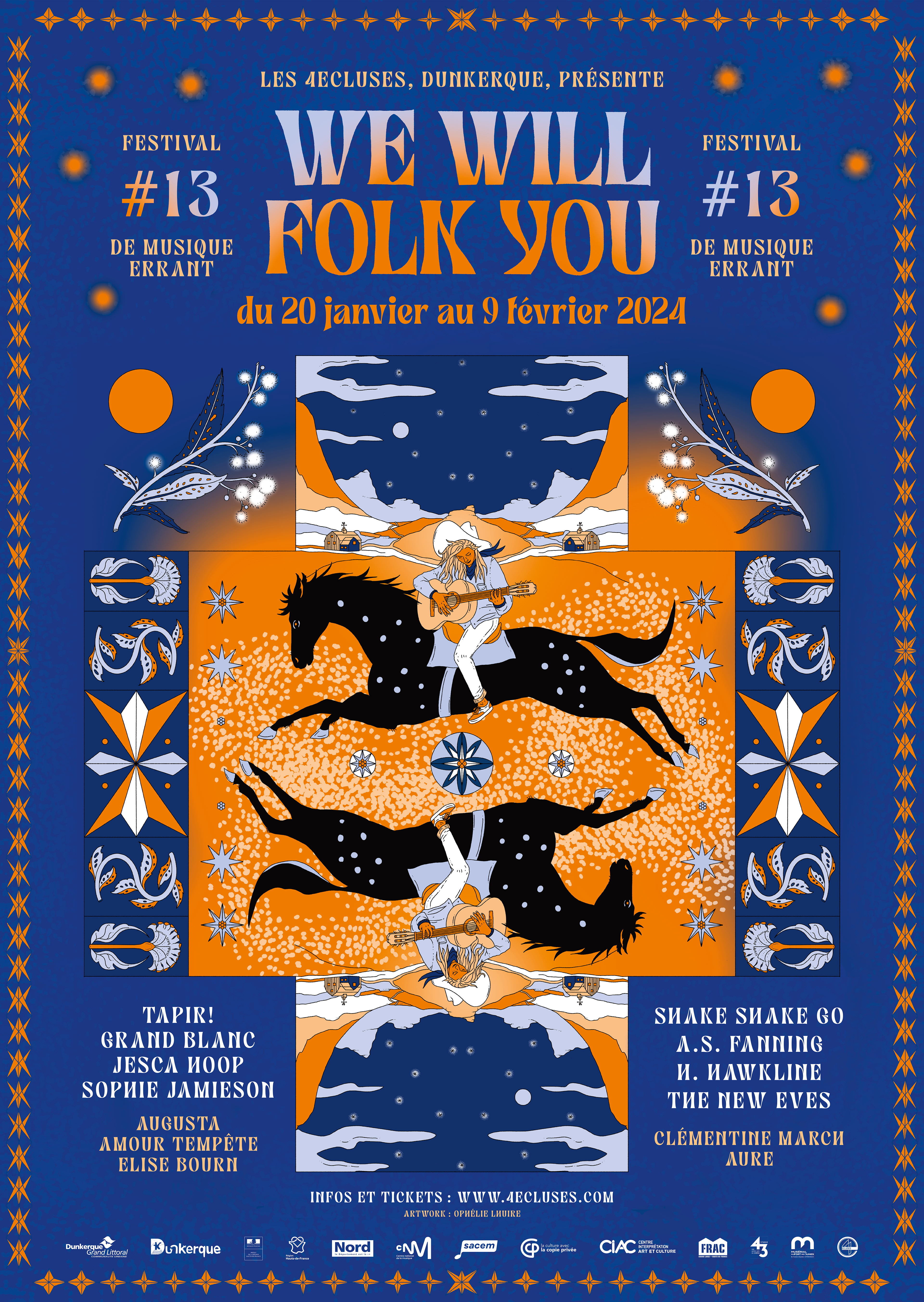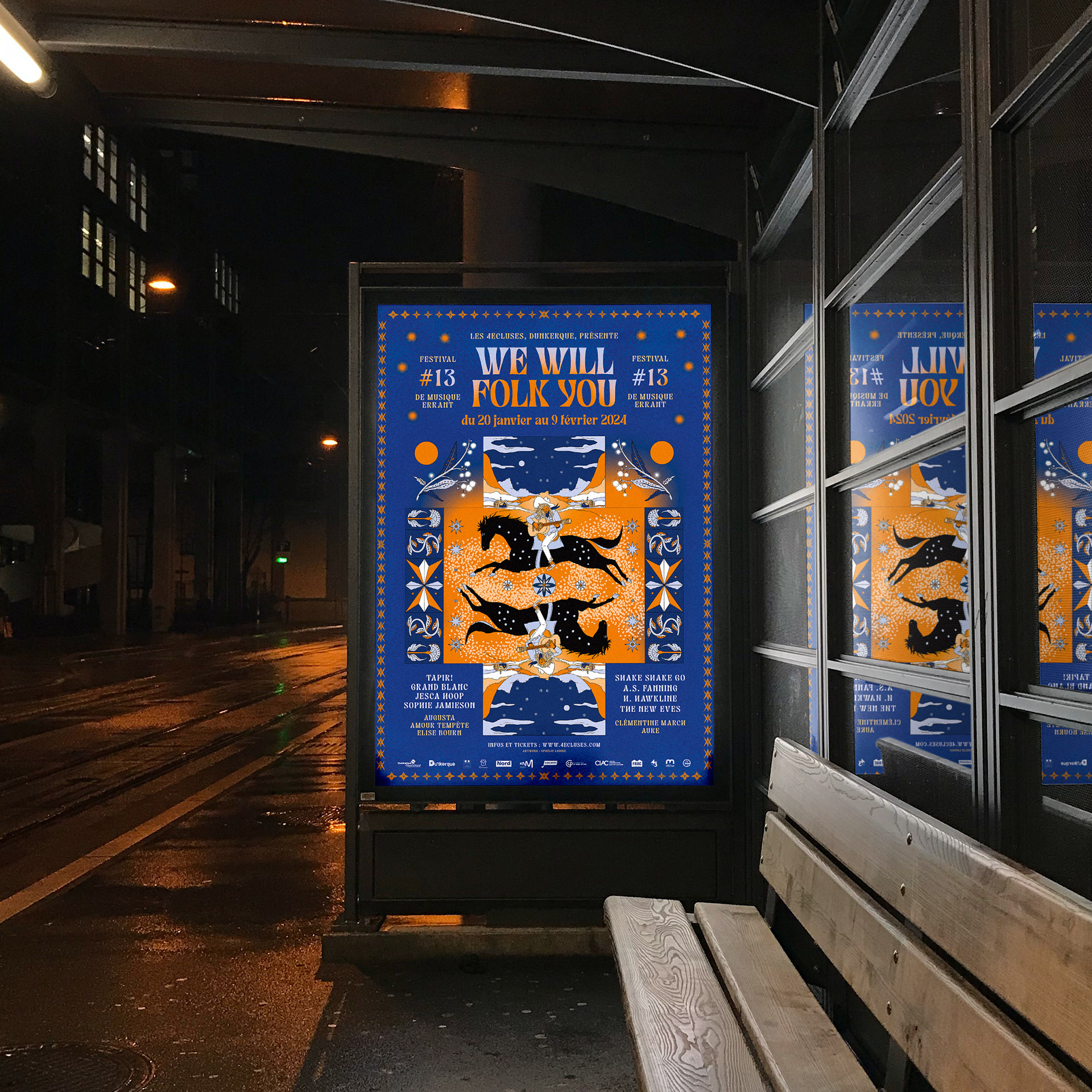 Création de l'identité visuelle pour le festival de musique folk : WE WILL FOLK YOU #13, pour les 4Ecluses. DATE : 20 janvier au 9 février 2024 LIEU : Dunkerque CLIENT : Les 4Ecluses SITE WEB : www.4ecluses.com